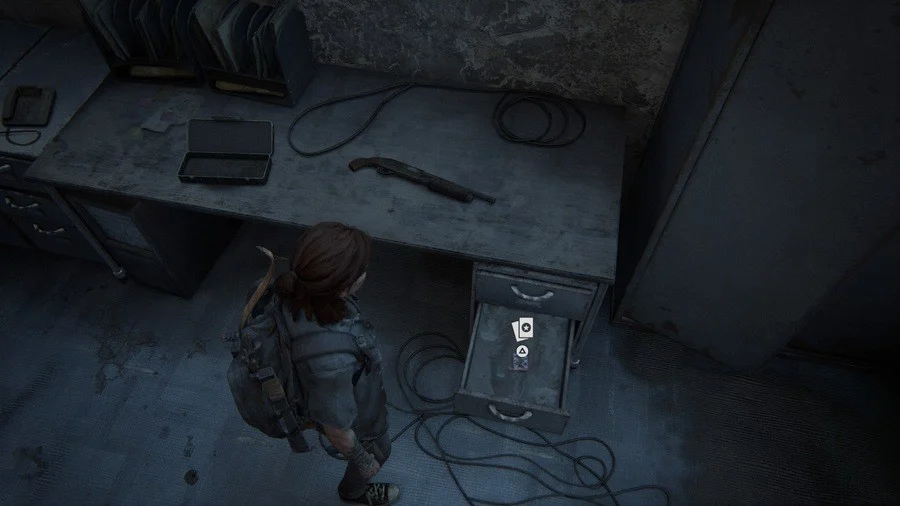 Спускаясь по отелю через металлические балки, после того как Эбби схватит приросший к стене зараженный, ищем комнату со шкафом и пустой рамкой. Там перепрыгиваем пропасть и берем монету со шкафа.