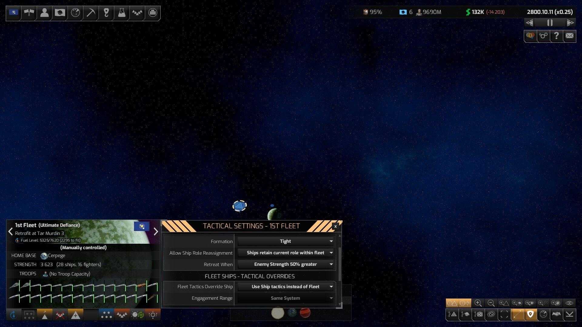 Радует обилие опций регулирования поведения флота: их действительно очень много. Более того, в игре не существует никаких искусственных ограничений на размер флота и его состав, все зависит исключительно от ресурсной и финансовой базы для его строительства и содержания. В поздней стадии игры потенциально возможно увидеть сражения флотов, состоящих из тысяч кораблей.
