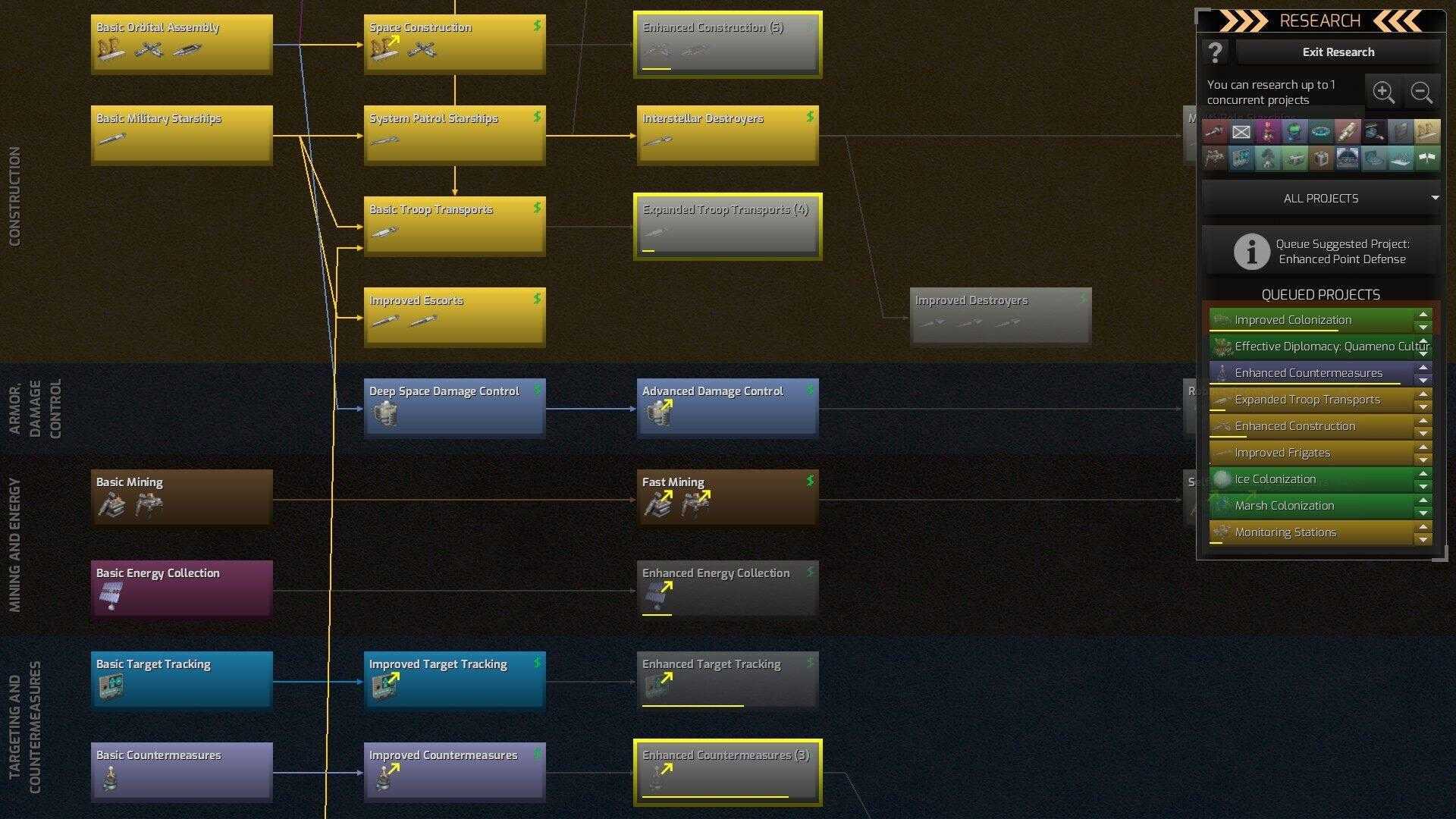 Развитие науки в Distant Worlds 2 достаточно стандартно для глобальных стратегий как с точки зрения организации исследований, так и с точки зрения предлагаемого спектра технологий. Но есть и несколько интересных фишек. Одна из них — зависимость «цены» какого-либо проекта в очках исследований от общего уровня технологий государства (в самом деле, дойдя до фотонных двигателей и эсминцев, довольно легко изобрести эффективные солнечные панели, а если не иметь даже ионных двигателей, то работать над конструкцией эсминца будет сложнее). Вторая любопытная особенность – возможность перераспределения ученых в специализированные исследовательские институты, что резко повысит эффективность работы над условно «инженерным» или «конструкторским» проектом, но в то же время замедлит работу над «социальным» или «биологическим».