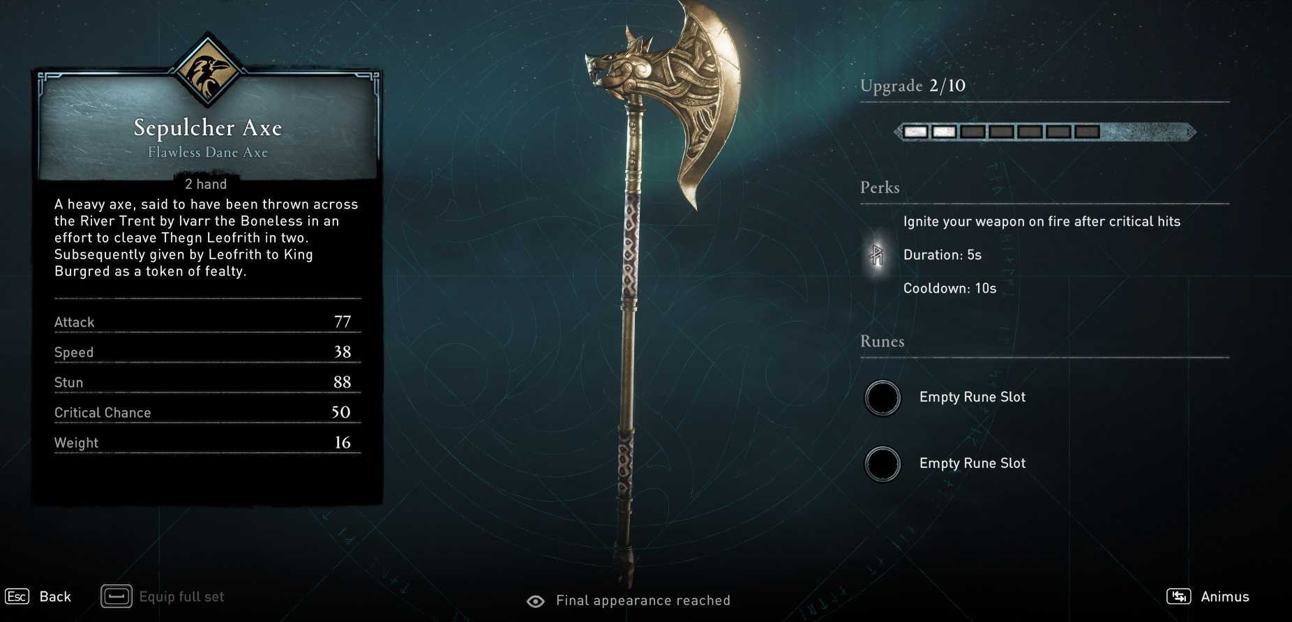 Этот двуручный датский топор — отличная пара для оружия с высокой критичностью из-за его уникального навыка, который поджигает оружие после критических ударов. Этот прекрасный топор не только силен, но и обладает такими навыками, как «Кремация на поле битвы» и «Тяжелое парное оружие в медвежьем дереве», этот топор в кратчайшие сроки сделает вас пироманьяком. Этот топор можно найти в основной истории в регионе Ледесестрескир.