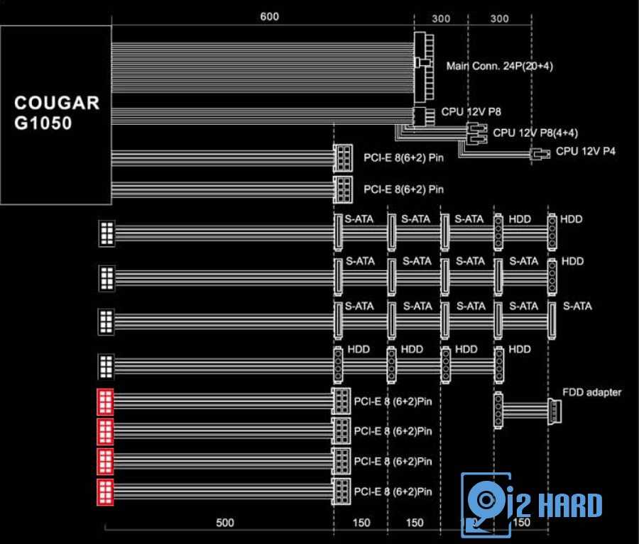 Длина всех проводов указана на изображении ниже. В большинстве случаев, длины всех кабелей блоков питания достаточно даже для установки в Full Tower, проблема возникает зачастую с подключением к разъему 8 пин для дополнительного питания процессора, так как провод прокладывается за задней стенкой корпуса, а сам разъем расположен в левом верхнем углу материнской платы. С Cougar GX 1050 такой проблемы не будет, так как длина провода составляет 90 см!