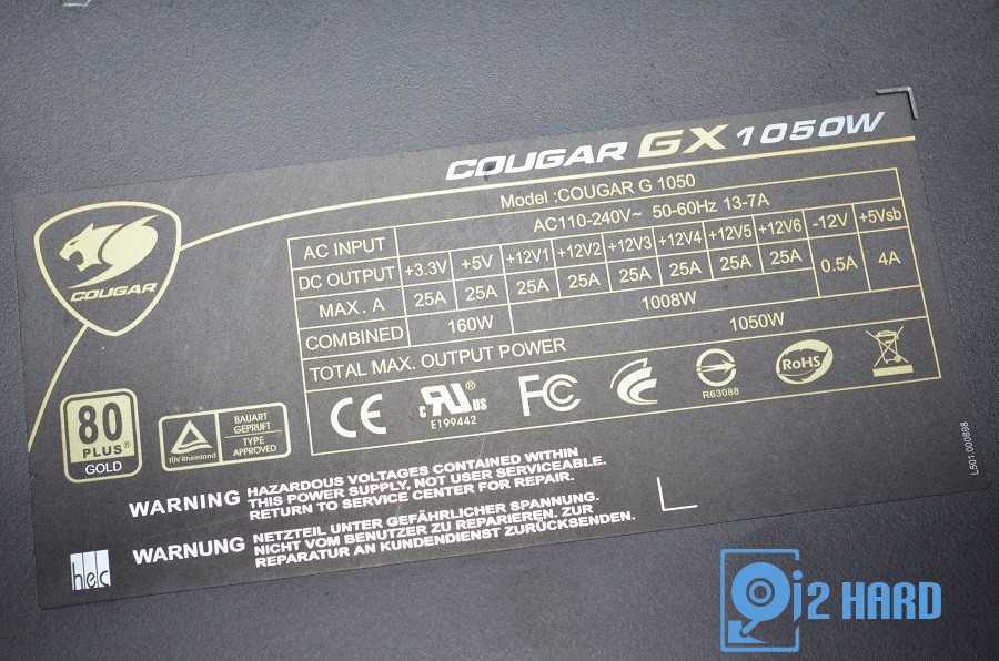 Таблица с максимальными нагрузочными параметрами для каждого канала указана на верхней части корпуса. По линии основного потребления +12В устройство способно «отдать» до 1000 Вт, что является очень хорошим показателем и можно смело утверждать, что данного блока хватит на любую высокопроизводительную конфигурацию с высоким потреблением. При этом следует учитывать, что суммарная отдаваемая мощность блока может быть снята либо по всем каналам в соответствии с рекомендациями производителя, т.е. не превышая нагрузку на каждый из каналов, либо только по линии +12В, но при этом остальные каналы сильно нагружать нельзя.