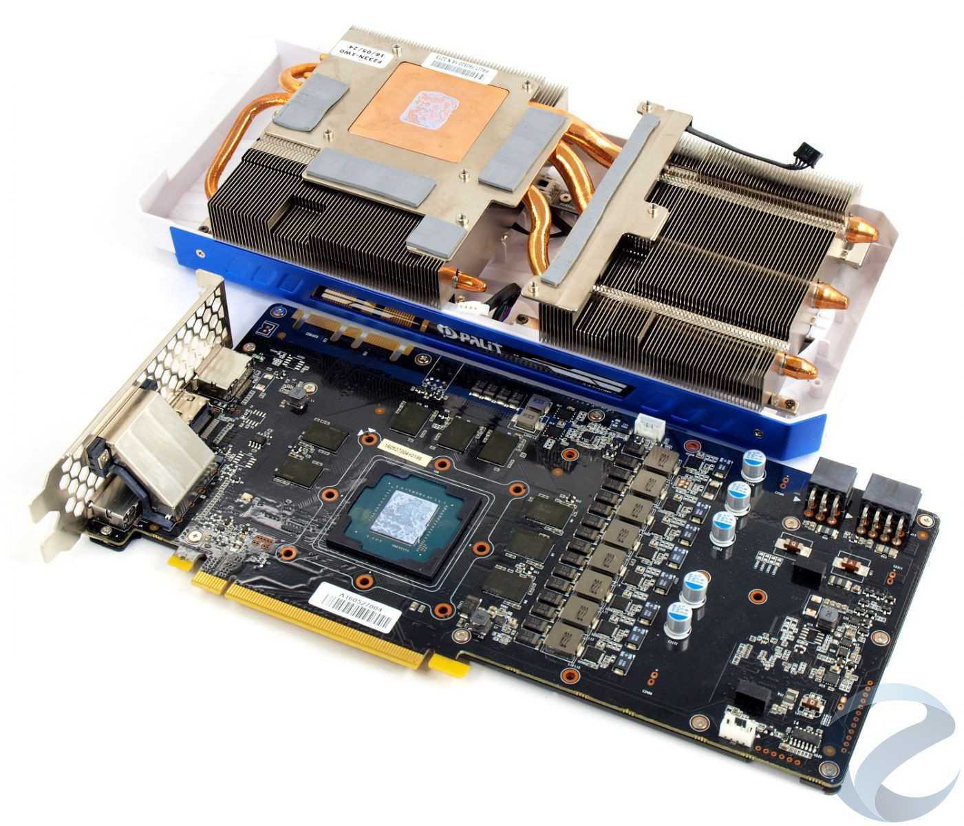 Компания Palit отошла от принятых стандартов и представила собственную концепцию графического ускорителя. Не захотев «вписываться» в двухслотовый формат, разработчики оснастили видеокарты массивным радиатором, эффективно справляющимся с поставленной задачей. Активную часть предоставили двум 100 мм вентиляторам, которые не стали прятать в профиле кулера и делать низкопрофильными. Этопозволяет им при меньшей скорости вращения создавать высокий воздушный поток ирассеивать тепло при низком уровне шума.