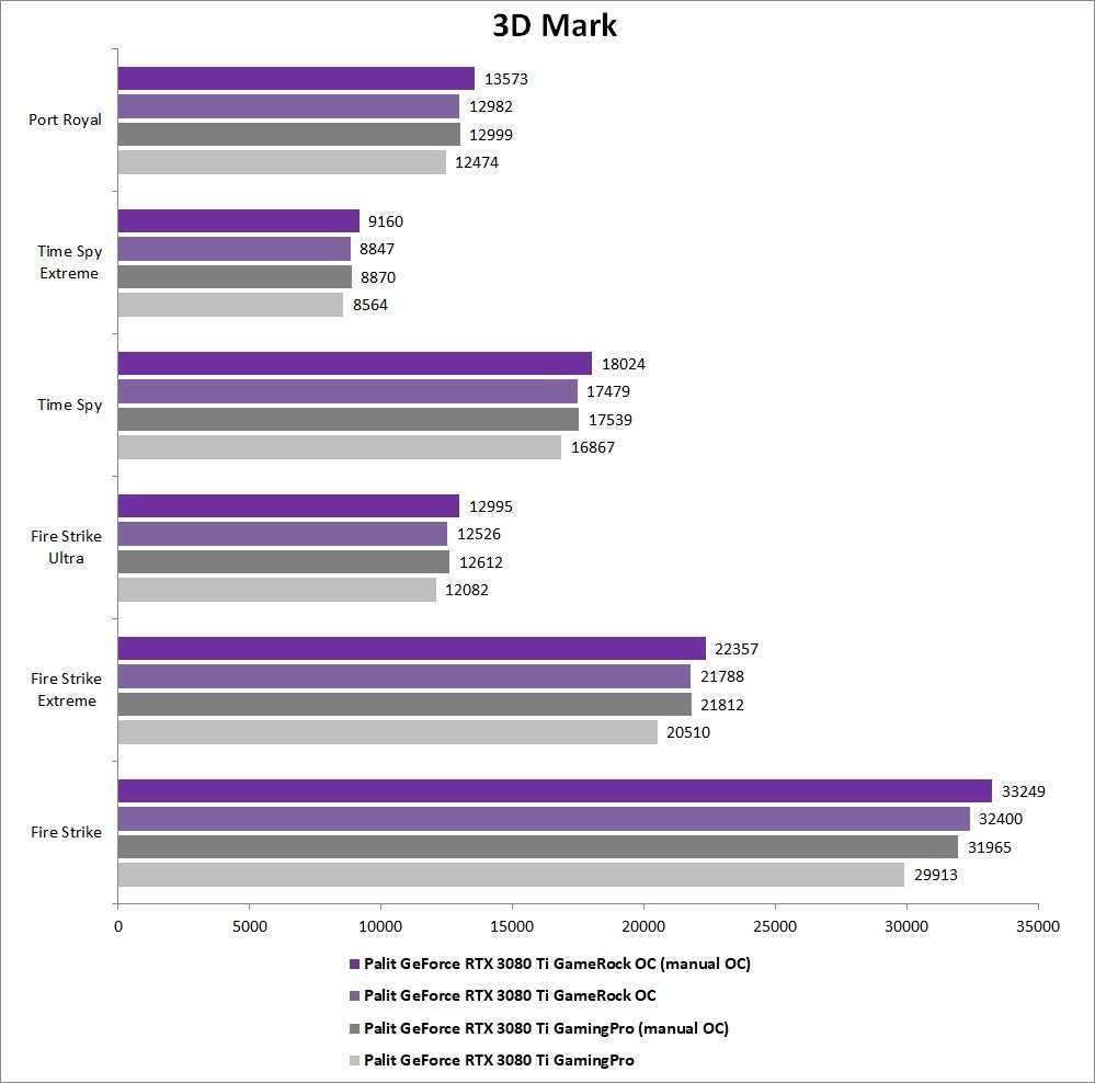 После оценки температур, энергопотребления, шума и оверклокерских возможностей видеокарт мы перешли к вопросу быстродействия графических ускорителей. В первую очередь измерили уровень производительности GeForce RTX 3080 Ti GameRock OC и GeForce RTX 3080 Ti GamingPro в популярном бенчмарке 3D Mark.