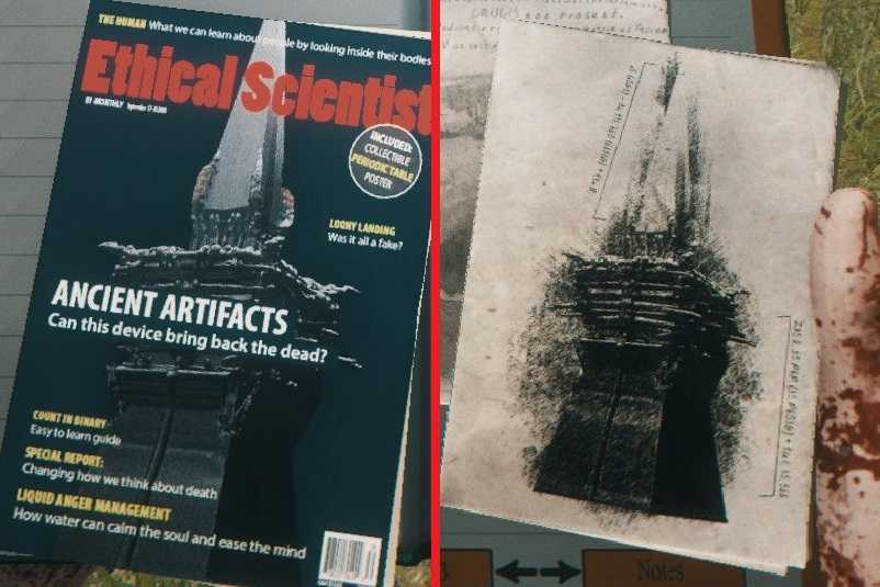 В пещерах мы можем найти зарисовку древнего артефакта. Вероятно, сделанную тем же человеком, что зарисовал крест и кратер. Сбоку имеются надписи и фигурными скобками выделены части артефакта: верхняя и нижняя. Также имеется обложка журнала «Этическая наука», на обложке которой изображен тот же самый артефакт! Заголовок статьи гласит: «Древний артефакт! Может ли он воскрешать мертвых?!». Итак, я предполагаю такое развитие событий: Красный человек забрал Тимми и отнес в бункер. Возможно, решил воскресить его. Журнал современный, а значит артефакт существует, и даже был сфотографирован. Думаю, его нашли исследователи и обнесли его бункером.