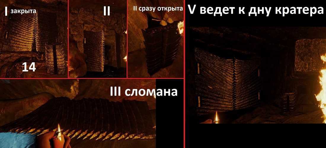Их пять. Первая в пятой пещере, четыре находятся в седьмой. Заметим, что первая закрыта, вторая уже открыта – на весах лежат палки и камни (Фото 14), а третья сломана. Четвертая дверь самая интересная. Если пройти в 7 пещере в месте с двумя бассейнами и каменным мостом чуть дальше, то мы попадем к этой двери и к самому дну кратера!