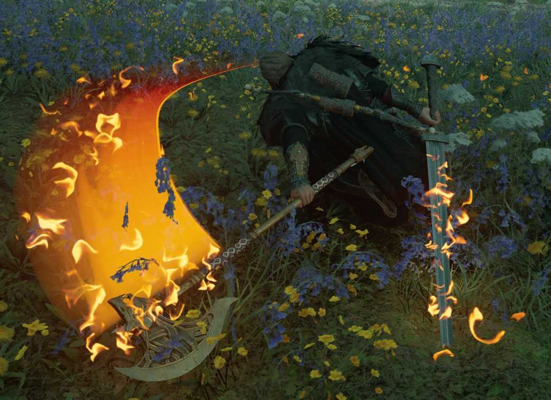 Двойное владение этим большим оружием наносит огромное количество грубого урона по области и урона от огня. С добавлением рун, улучшающих шанс критического удара, они становятся благочестивыми. Вас ждет буря пылающих клинков.