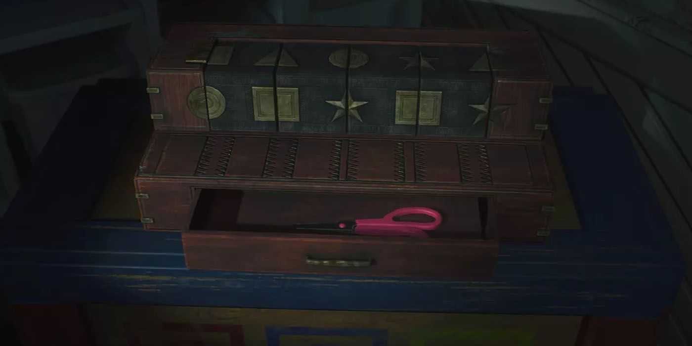 Чтобы начать загадку, Шерри нужно сначала подобрать Вещую куклу в задней части спальни. Осмотрите куклу и откройте ее, чтобы найти внутри блок. Теперь поместите блок в саму головоломку с блоками и переставьте все блоки, чтобы решить ее. Возьмите Ножницы и используйте их, чтобы разрезать изоленту, удерживающую картон на стене, чтобы открыть скрытый путь.