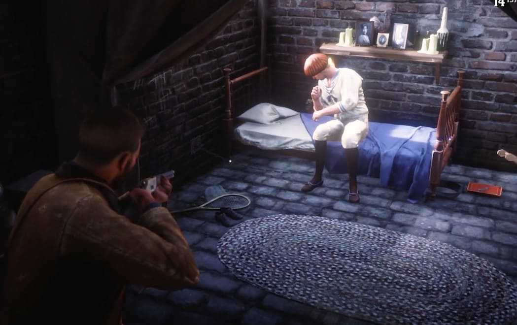 Через какое-то время Мика приблизится к сортиру, где его схватит внезапно появившаяся Сэди. Тогда же на башне возникнет ваш старый знакомый – Датч, который уровняет шансы. Воспользовавшись замешательством, Мика выхватит пушку у Сэди.