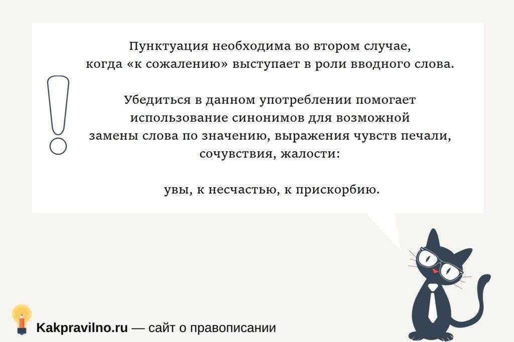 Второй способ проверки – нужно убрать слово «к сожалению» из предложения. Если смысл сохраняется, значит, конструкция является вводной, а знаки препинания ставятся с учетом ее места нахождения.
