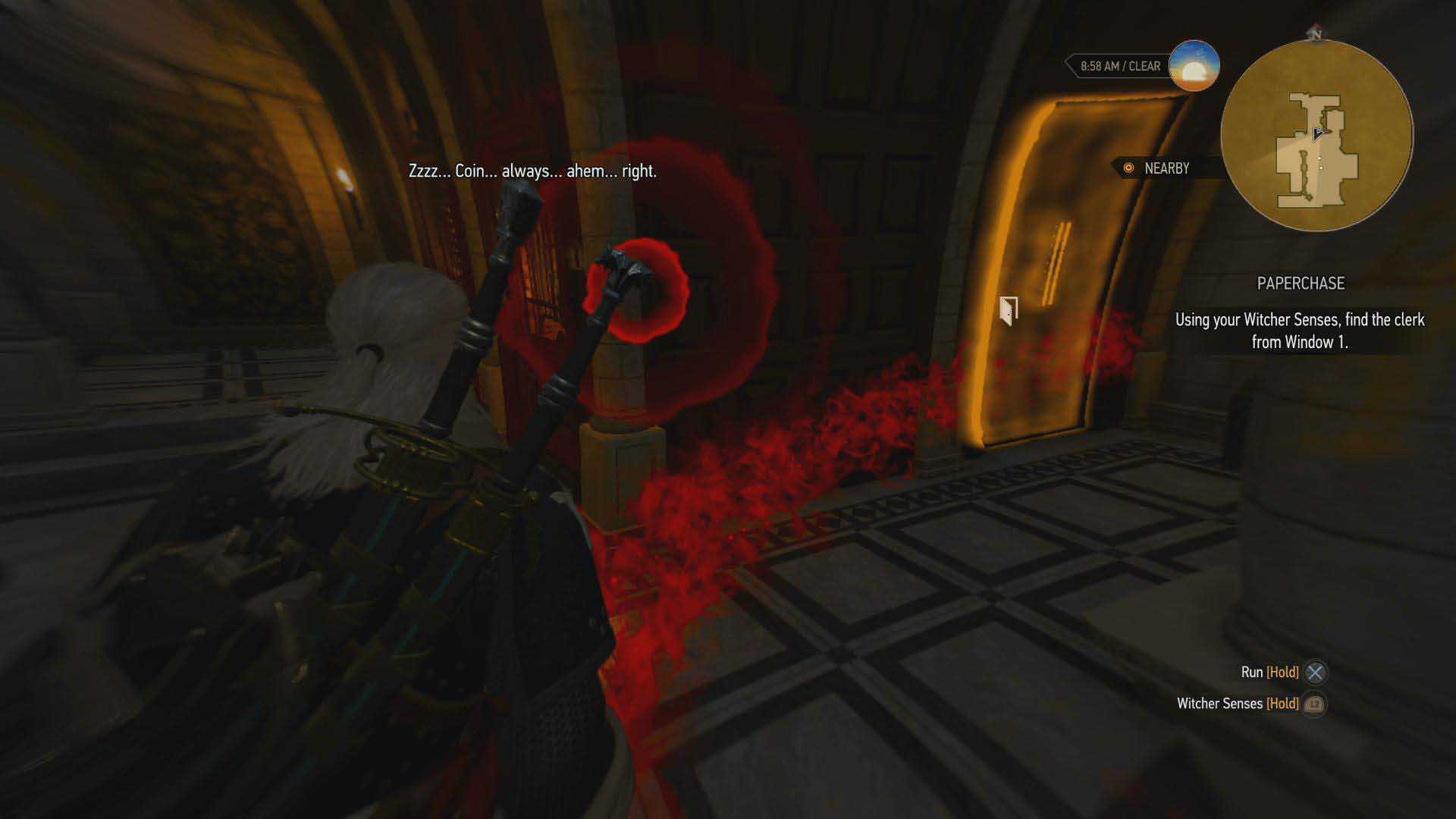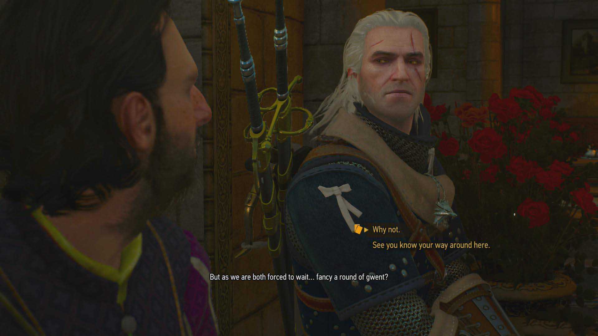 Вернитесь к окну 1. Но там вас уже никто не будет ждать. Используйте свое ведьмачье чутье, чтобы проследить по следу запаха. После того, как вас прогнали, подойдите к клиенту банка, сидящему возле окна 1, который вовлечет вас в светскую беседу. В конце концов вы получите выбор, в котором ваше решение имеет какое-то значение; ответьте: «Почему бы и нет». чтобы скоротать время в игре в гвинт — он выставит умеренно сильную колоду скоя’таэлей — или скажет: «Видишь, ты знаешь, как здесь ориентироваться».