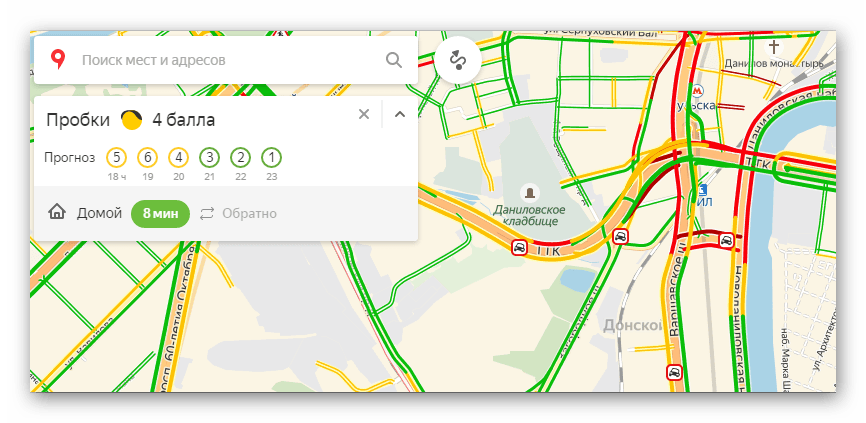 После этого схемы автодорог окрасятся разноцветными линиями, которые и обозначают степень загруженности движения. Также в этом режиме будут отмечены места, где произошло ДТП или идут какие-либо дорожные работы. Слева, под поиском появится табличка, в которой вы увидите насыщенность пробок в баллах по версии Яндекс и их прогноз на несколько часов вперед.