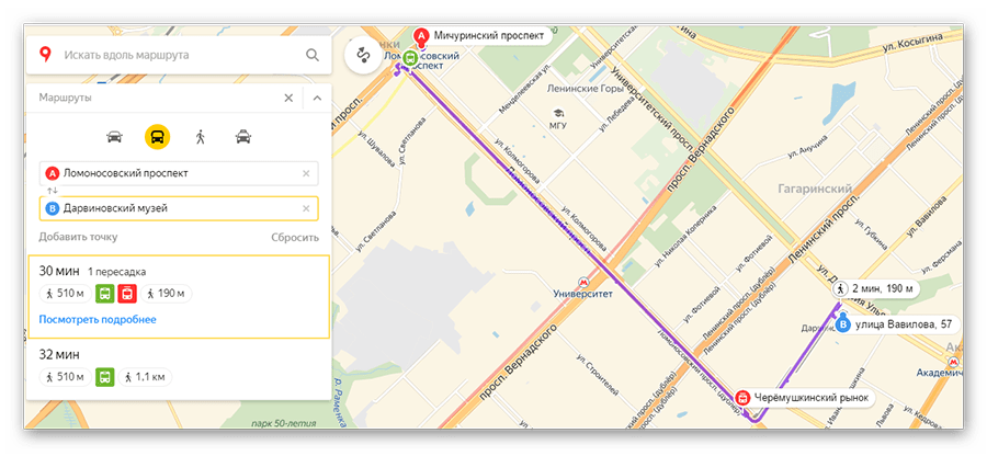 Под строкой поиска отобразится меню построения маршрута, где в первую очередь выберите, каким образом вы будете передвигаться — на автомобиле, городском транспорте, такси либо пешим ходом. Следом, в строке А, укажите адрес или место, откуда собираетесь начать движение, в строке В – конечную точку. Также, чтобы не вводить адреса вручную, проставить отметки на карте возможно курсором мыши. Кнопка «Добавить точку» позволит отмечать дополнительные локации, где необходимо останавливаться по мере движения.
