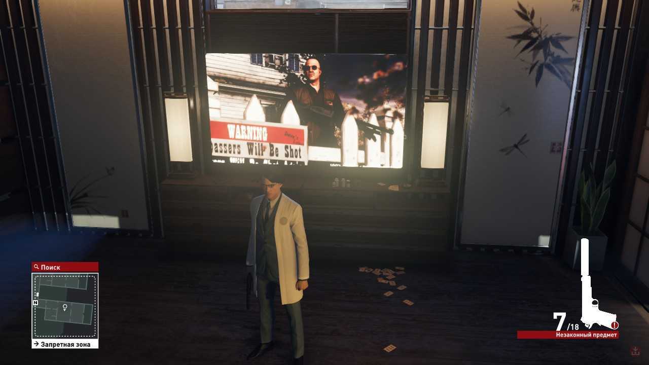 Теперь нам нужен второй этаж. Спускаемся и с балкона смотрим на подиум, где появляется Виктор Новиков. Он начнет речь и ваша задача успеть всё сделать до её завершения. Стреляем из пистолета с глушителем и уходим из локации.