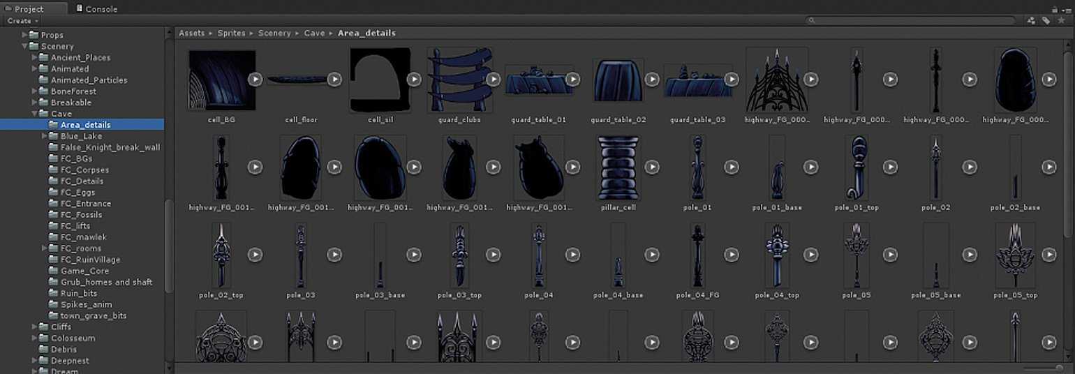 Team Cherry создала отличительный визуальный стиль из нарисованных от руки рисунков и традиционной анимации, сделанной в Photoshop. Вместо сложных 3D-систем освещения разработчики использовали мягкие прозрачные формы. Команда создавала уровни с помощью 2D-активов, наложенных на 3D-среду, используя двухмерную физику, упаковщик спрайтов и систему частиц из набора инструментов из магазина ассетов.