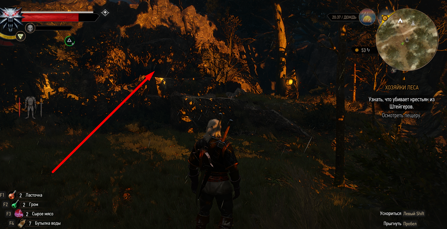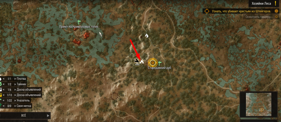 Слышим странный голос который предупреждает нас не приближаться. Подойдя к большому дереву на холме, квест дополняется – нужно найти проход под холмом используя ведьмачье чутье.
