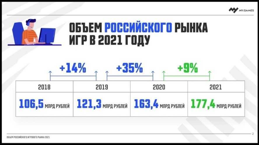 Несмотря на некоторую стигматизацию сообщества и ограниченную покупательскую способность большей части населения страны, российский игровой рынок до 2022 года рос. По данным MY.GAMES, в 2021 году объем отечественного рынка видеоигр в 2021 году достиг 177,4 миллиарда рублей.