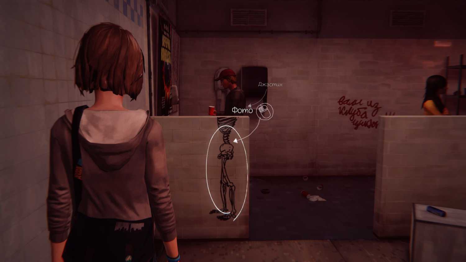 Затем проходим в душевую (уборная) и слева видим стоящего Джастина, а внизу на кафеле – граффити скелета. Делаем забавную фотографию (50).
