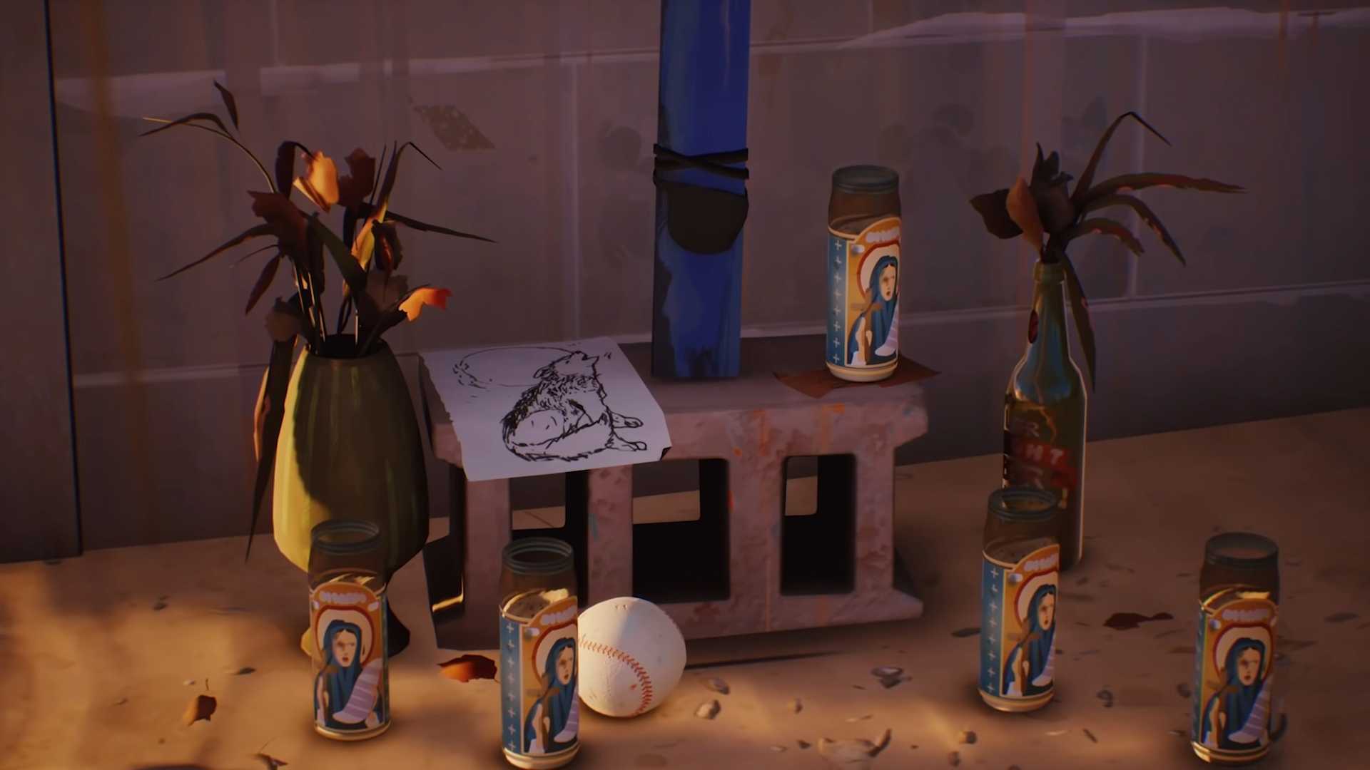 Закончив рисовать, он идёт к дому, где у него устроен маленький алтарь в честь Шона, и кладёт на него рисунок, изображающий волка, воющего на луну.