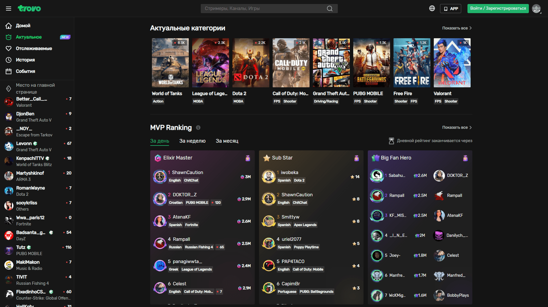 Ежедневно на ”Твич” заходят больше миллиона человек. На главной странице показывают рекомендуемые категории, каналы и сообщества (в том числе и небольшие — на радость новичкам).