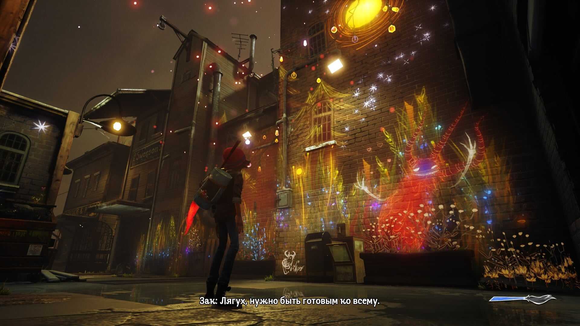 Принцип «оживления города» на самом деле не связан с качеством или изобретательностью рисунков. Поначалу они нужны лишь для того, чтобы зажигать развешанные повсюду гирлянды из больших белых ламп – как только герой активирует всю иллюминацию района, где-то неподалеку исчезнет пелена тьмы, закрывавшая проход к следующей локации.