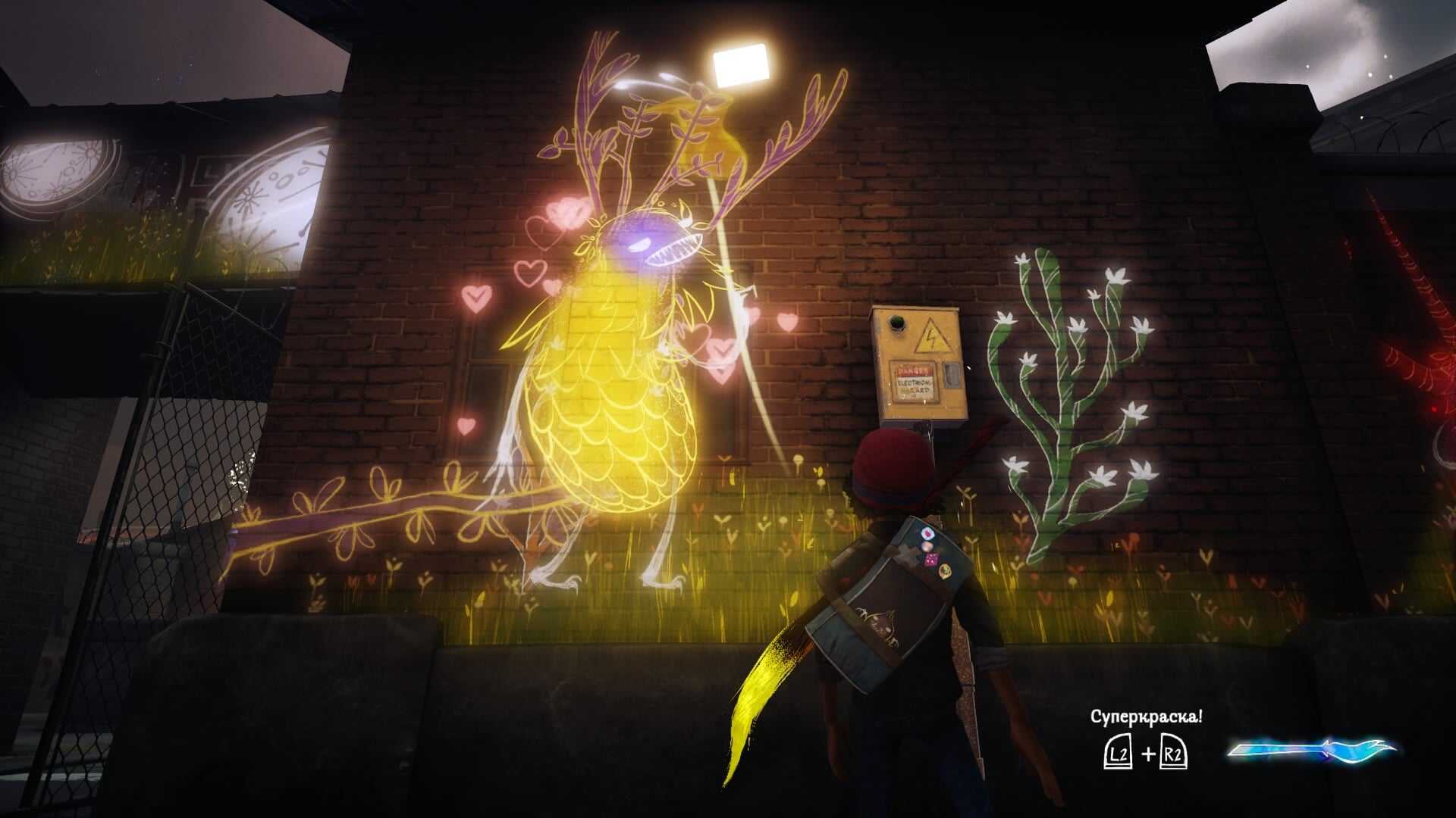 Помимо зажигания лампочек, Эшу встречаются места для создания новых существ – их дизайн вы придумываете сами, пользуясь чем-то вроде двухмерной версии редактора из Spore. Существа, к слову, иногда просят что-то нарисовать для них, за что герой получает заряд супер-краски – ей можно рисовать поверх стен, зараженных тьмой. На крышах города расположились выцветшие билборды – их тоже можно оживить свежим слоем краски. Наконец, вы можете рисовать и просто в свое удовольствие, для этого даже предусмотрен отдельный режим. Есть и отдельная часть игры для PS VR, но ее я опробовать не мог.