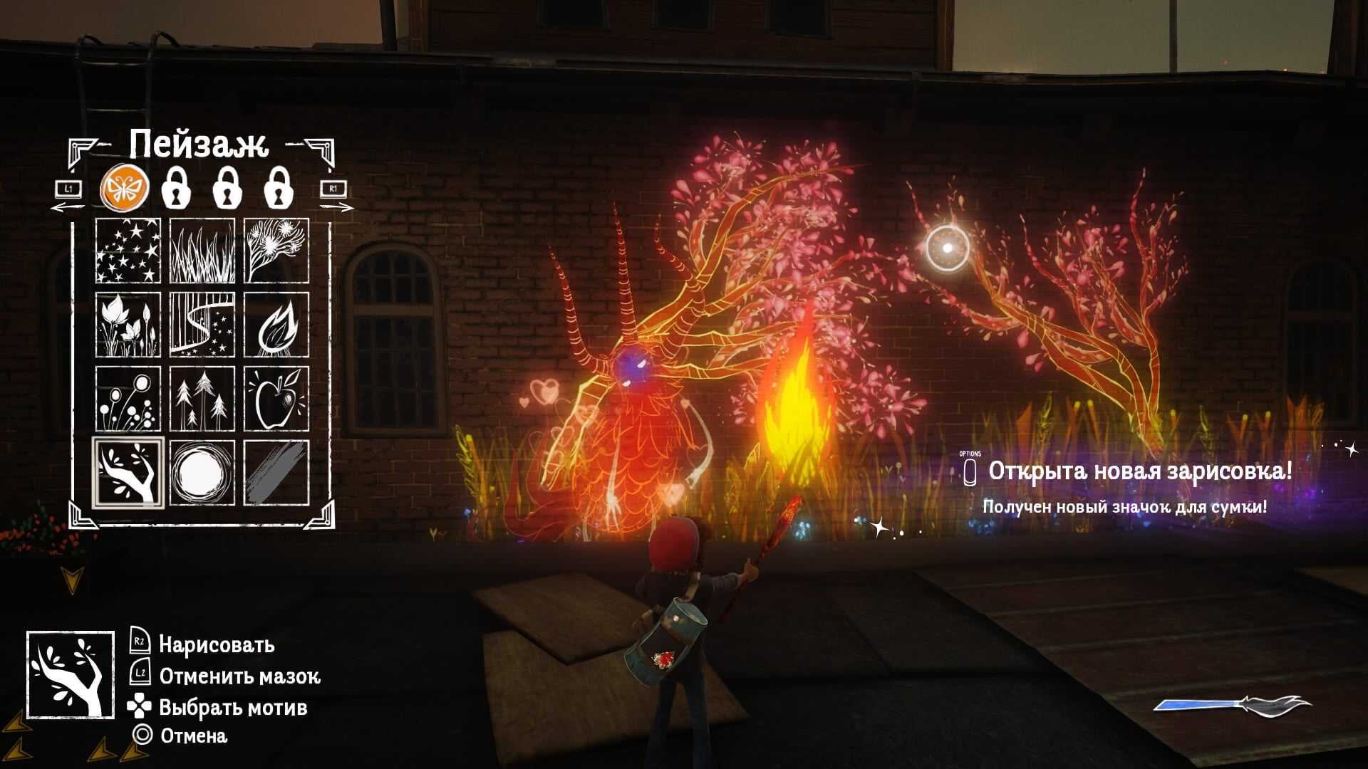 Concrete Genie удивляет точным балансом между свободой творчества и простотой этой основной механики. При нажатии «квадрата» в любой точке города открывается меню с наборами кистей, отсортированных по вкладкам: растения, пейзажи, космические тела и так далее. После выбора одной из них крестовиной, достаточно навести «прицел» (кисть) на любую стену поблизости и по нажатии правого курка герой начнет рисовать.