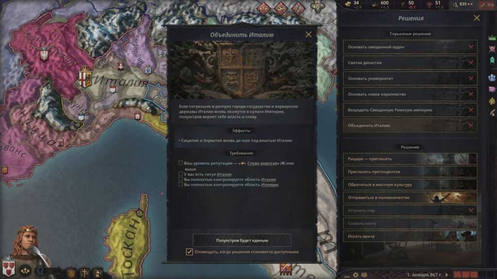 - Стать императором Византии или императором Италии (для этого вы должны принять серьёзное решение «Объединение Италии», чтобы появилось новое решение «Восстановить Римскую Империю»). Чтобы решение «Объединение Италии» стало доступно, вы должны принадлежать к итальянской культуре (сицилийская, ломбардская или цизальпинская не считаются).