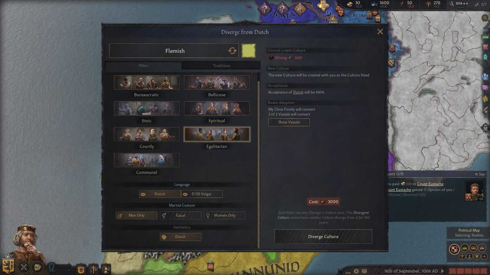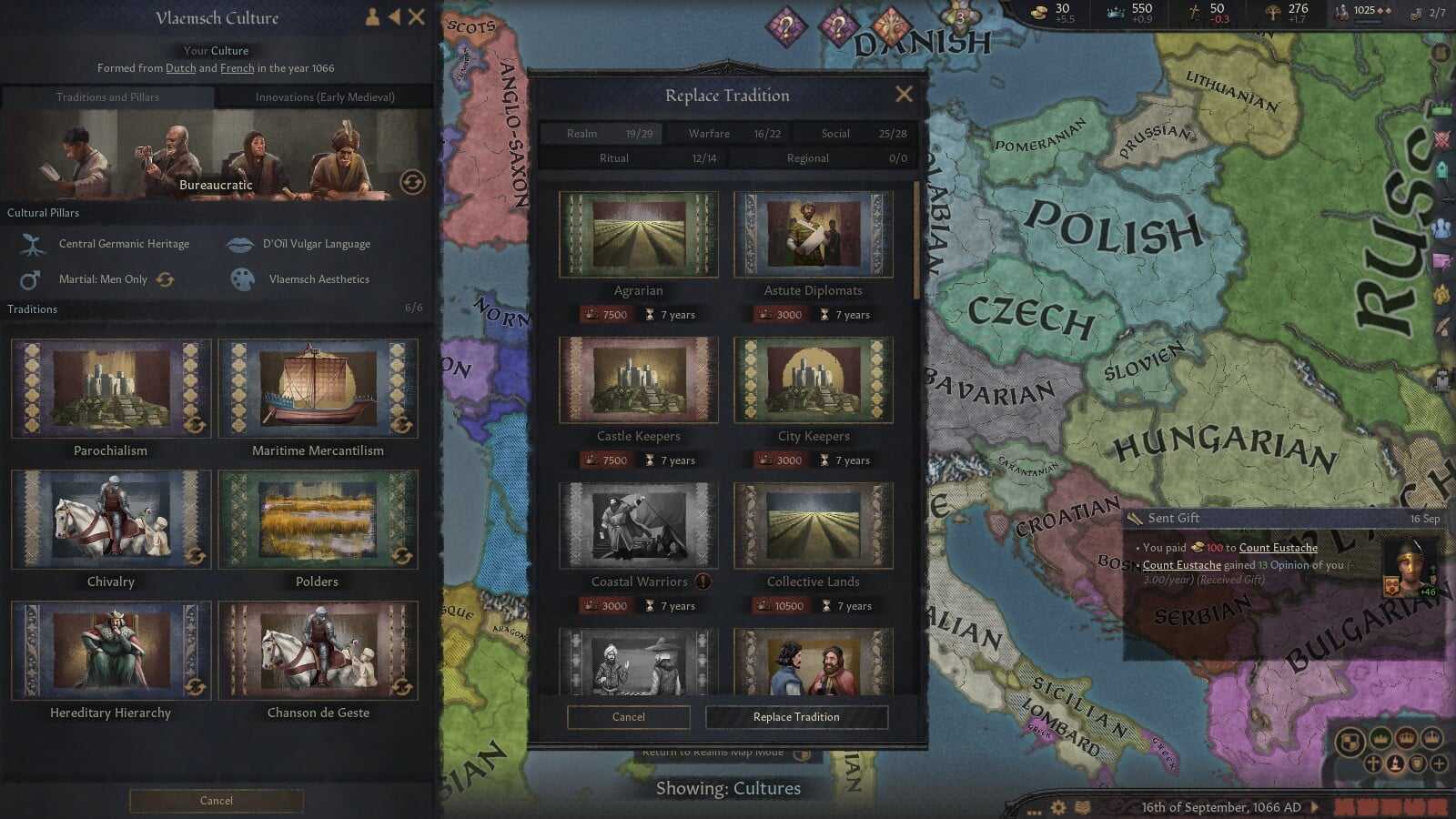 Наконец-то культуры перестали быть просто циферкой с плюсом/минусом к отношениям. Теперь это по-настоящему увлекательная механика игры с собственным развитием. Вы можете как «улучшать» собственную культуру, так и пойти на компромисс с какой-то близкой. Например, превратив нидерландцев во фламандцев, смешав культуру с французской.