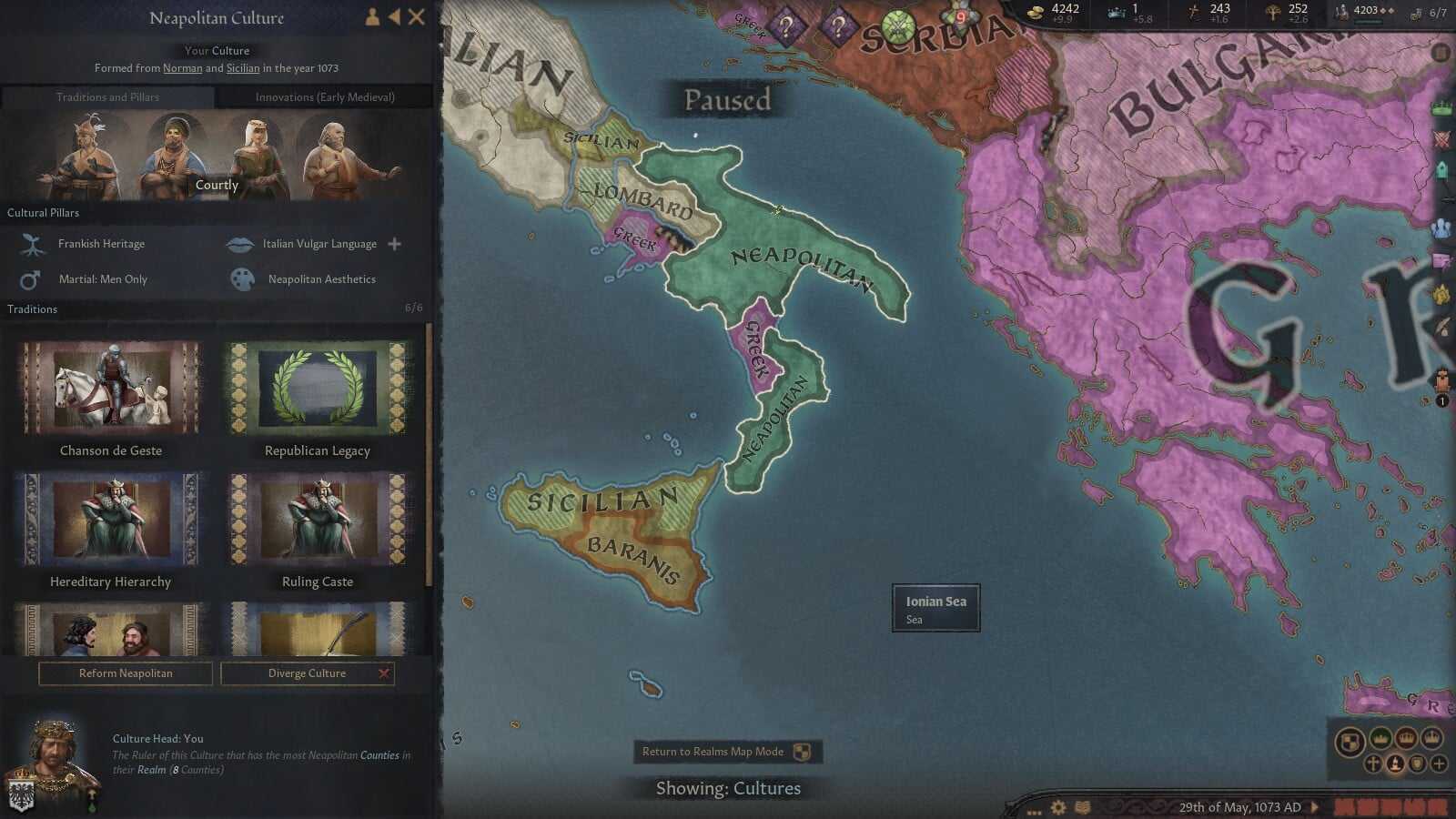 Другой вариант – смешать нормандскую культуру с местной итальянской. Название, конечно, можно менять на ваш выбор. В моем сэйве представители новой культуры стали неаполитанцами. При смешивании культур вы выбираете не только название, но и основные характеристики. Они берутся из обеих культур, а на выбор можно взять 6 традиций.