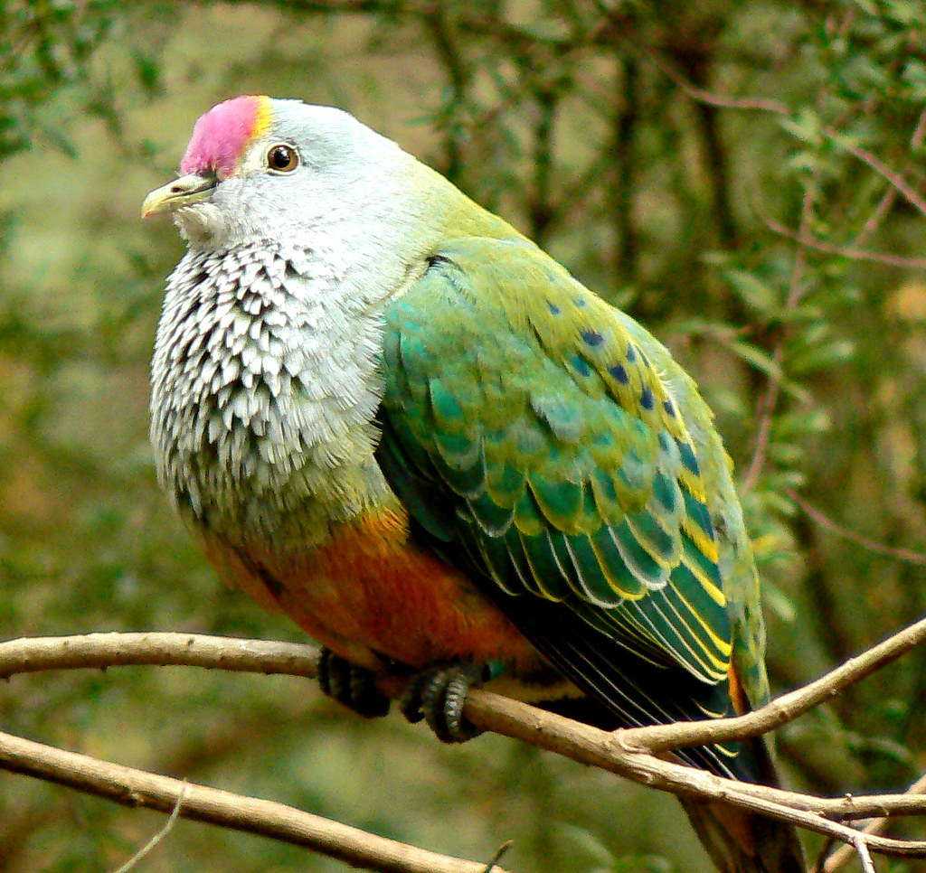 Пестрый розовошапочный отличается оранжевой грудкой, розовой головкой и наличием разнообразных оттенков.