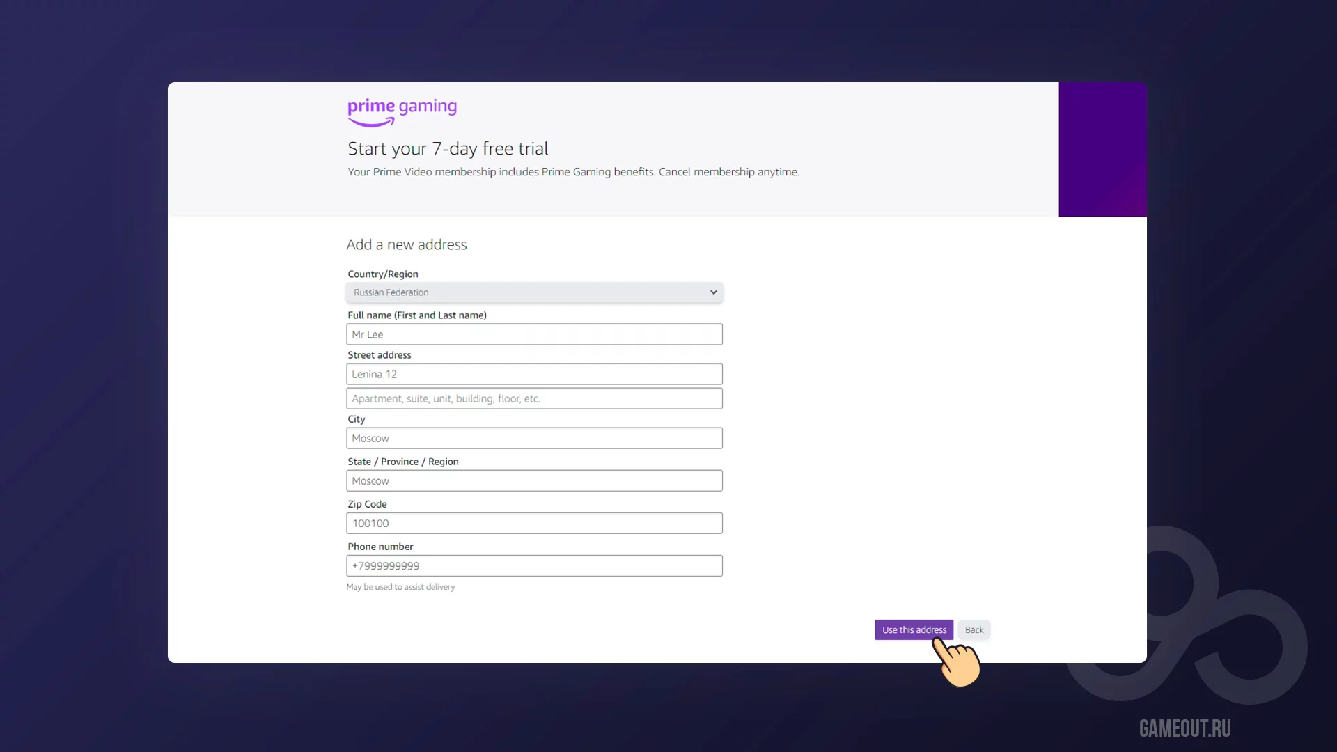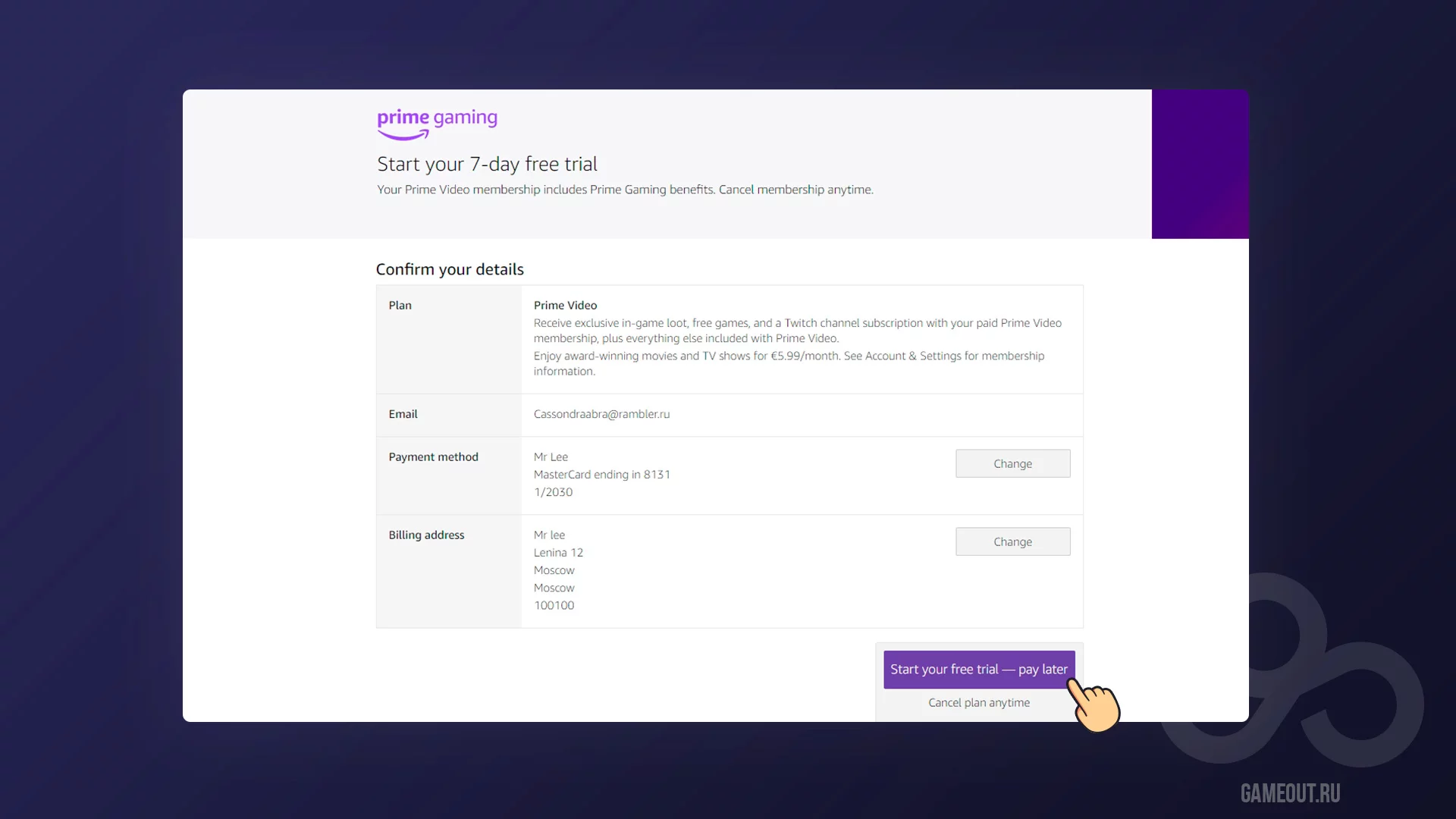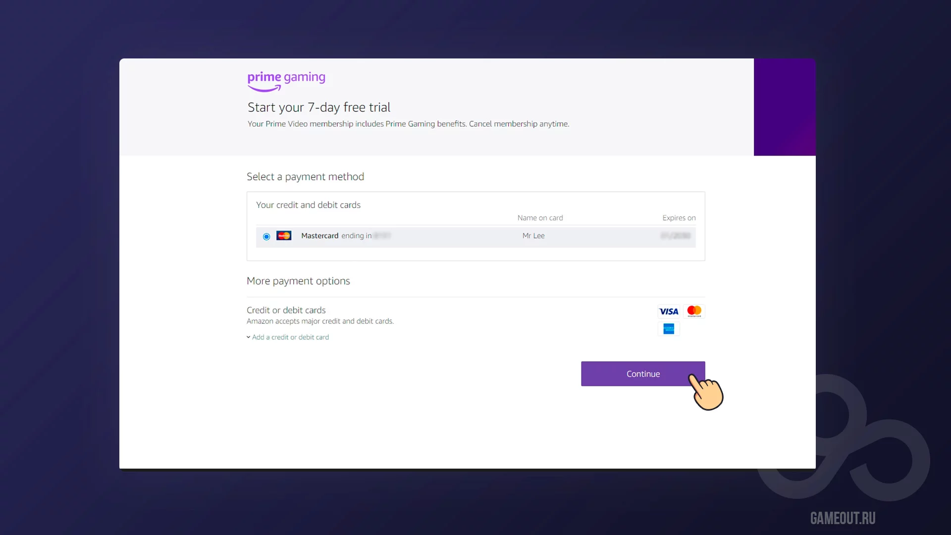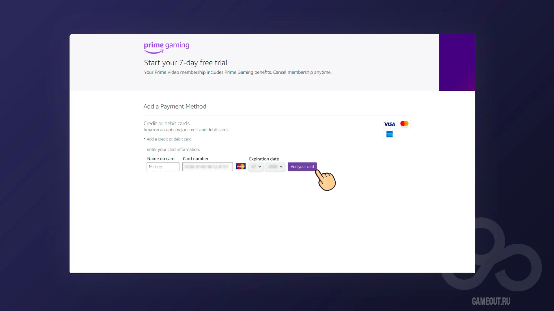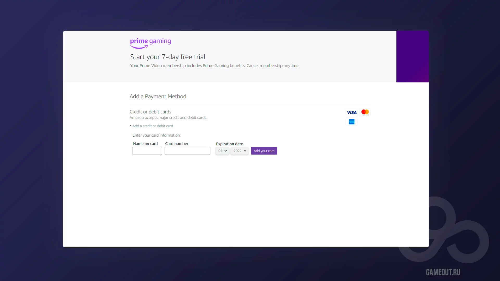 Следующим шагом при оформлении бесплатной подписки Prime gaming на 7 дней будет ввод карты.