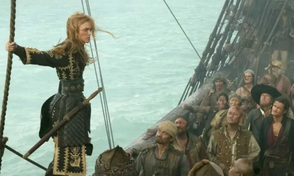 Кира Найтли в роли Элизабет Свон. «На краю света» первоначально считался последним фильмом в трилогии фильмов «Пираты». Disney
