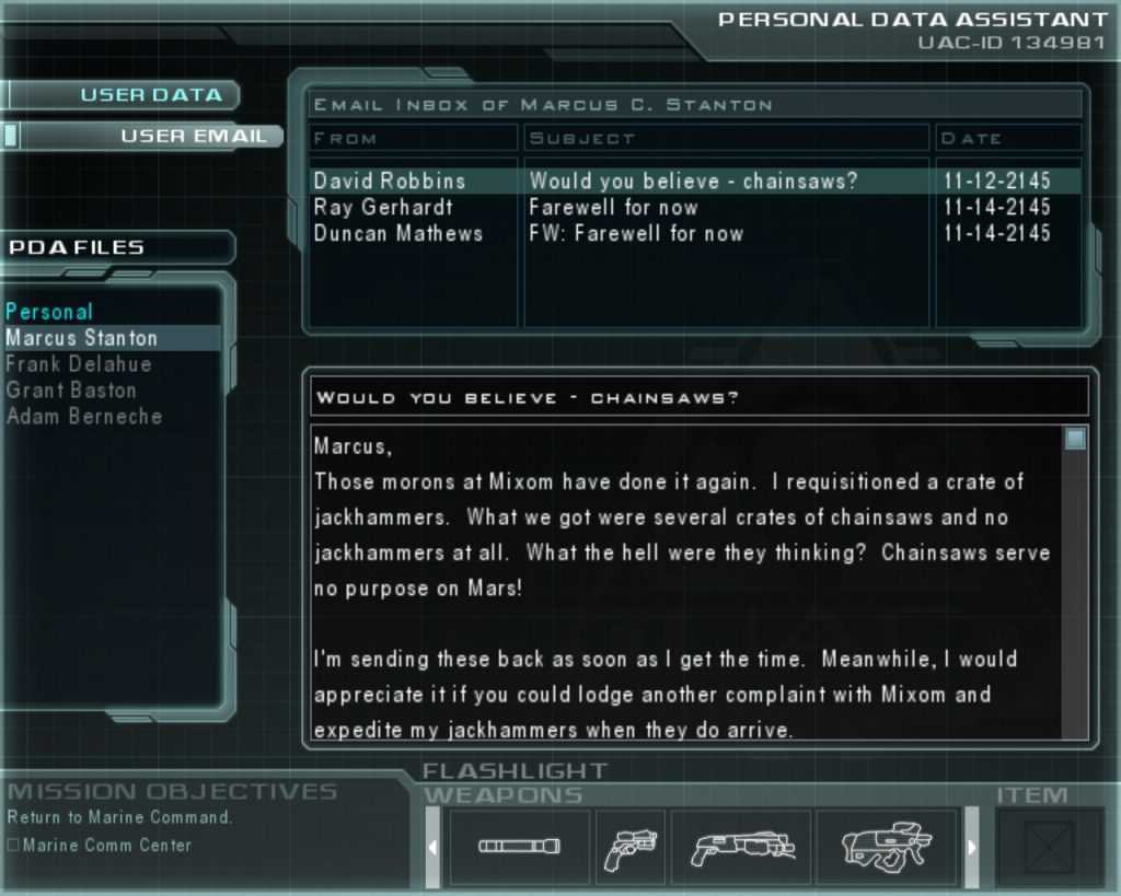 Одна из самых знаменитых «записок» в DOOM 3, объясняющая откуда взялись бензопилы на Марсе.