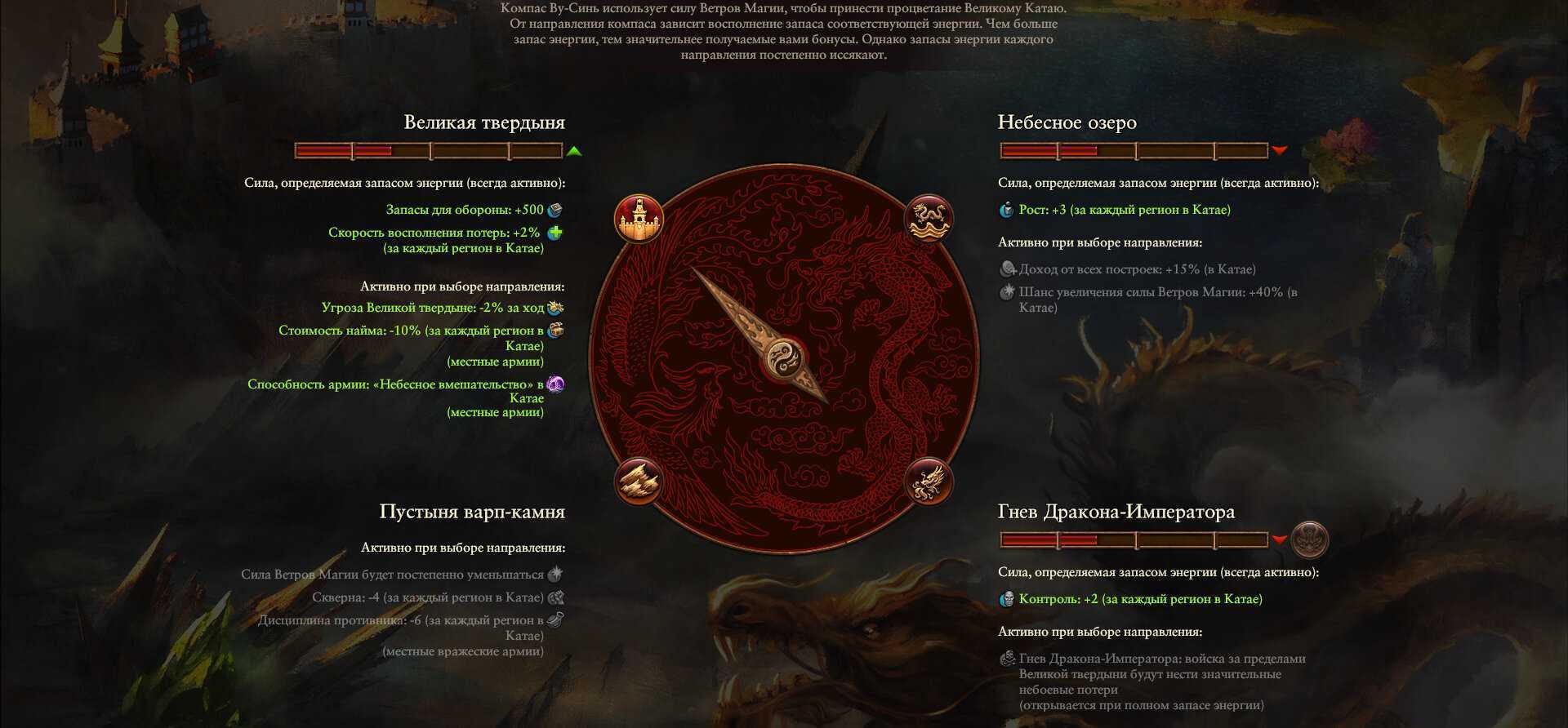 Каждая большая фракция отличается не только составом армии, но и механиками на глобальной карте. Катай следит за сохранностью Великой Твердыни, отправляет караваны по землям огров, управляет балансом энергий инь и янь и движением компаса Ву-синь. Компас усиливает рост в провинциях, оборону городов или ветра магии. А караваны работают как отдельная мини-игра со своими квестами и ивентами.