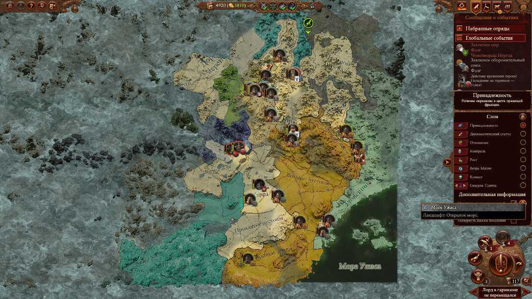 А мир Слаанеш – отдельная, очень многогранная игровая механика. Чтобы добраться до цели, нужно пройти 7 кругов греха. Каждый из них пытается соблазнить игрока артефактами, способностями, баффами к армии и дипломатии и просто огромной суммой денег. Если игрок принимает дар Хаоса, он покидает царство Слаанеш и не может вернуться до следующего открытия порталов. В кризисных ситуациях или если игрок опережает остальных по количеству душ, в мир порока можно приходить специально за бонусами. Так можно спасти, казалось бы, проигранные партии.
