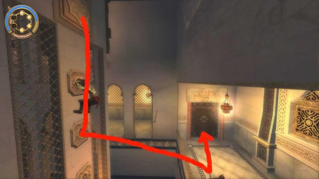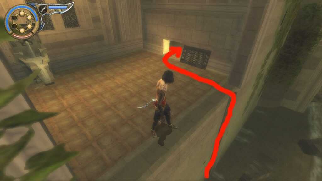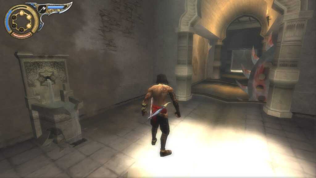После того, как вы впервые закончите играть за темного принца и снова станете нормальным принцем, поднимайтесь, пока не окажетесь возле двух дверных проемов. Это сразу после того, как вы сражаетесь с врагами, которые боятся света, в темных комнатах со светом, исходящим сверху. Там есть кинжал, который открывает дверь. Пройдя через эту дверь, у вас будет два пути. Один слева и один справа. Левый путь ведет к обновлению жизни, а правый путь с лезвиями ведет к фонтану сохранения и следующей области.