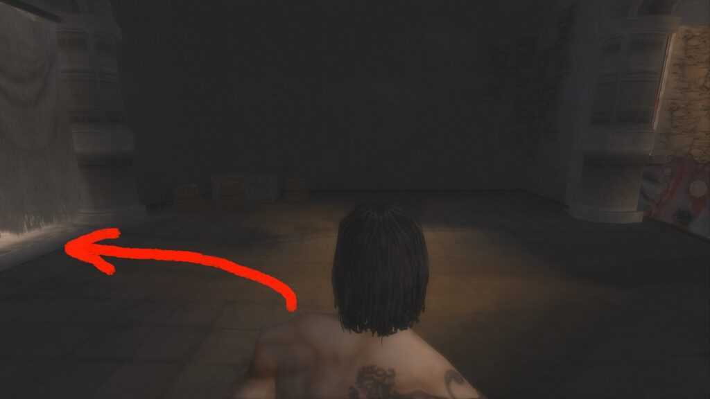 В стене должно быть закрыто отверстие занавеской. Проберитесь внутрь и продолжайте движение к фонтану. Если вместо этого вы пойдете наверх, вы продолжите рассказ.