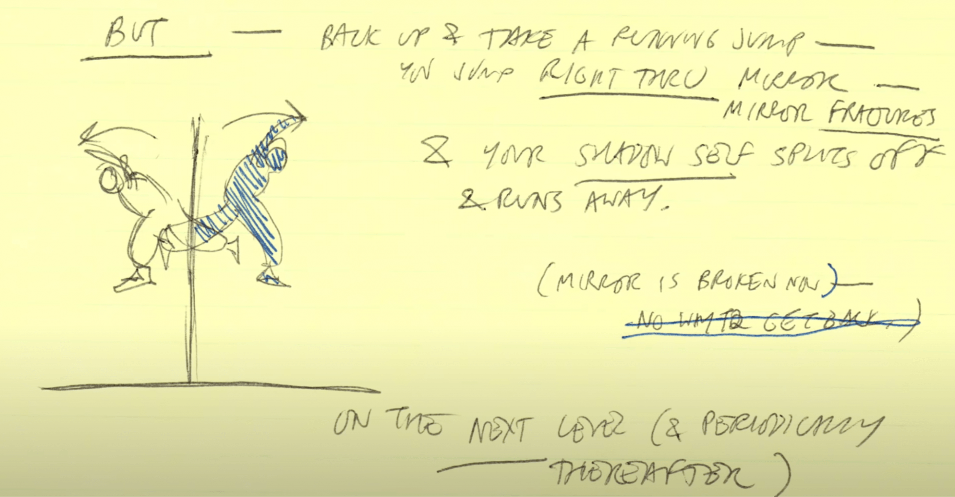 Глядя на результат, разработчик понял, что у него получился как бы теневой двойник главного героя. Чтобы объяснить его внешний вид, Джордану пришлось придумать целую историю прохождения игрока через зеркало: в тот момент, когда герой проходит сквозь зеркало, с обратной стороны выходит тот самый теневой персонаж:
