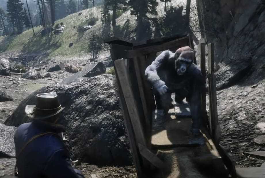 Если интересно, что горилла делает в таком месте, можете отправиться немного восточнее от ее текущего местоположения. В лесу есть красочный дом, вокруг которого много тушек животных.