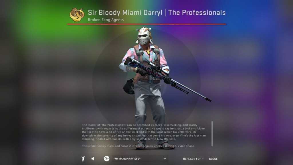 Самый дорогой агент на данный момент – это Сэр «Чёртов Майами» Дэррил, оцениваемый в 15.49 долларов. Дэррил – лидер «Профессионалов», и у него в игре целых 5 скинов, но пестрый Майами-прикид почему-то полюбился игрокам больше всего. Смею предположить, что отчасти из-за ностальгических геймерских воспоминаний по Вайс-Сити, потому что, как гласит описание скина: «Увлёкшись эстетикой восьмидесятых, он начал носить белую хоккейную маску и цветочную рубашку».