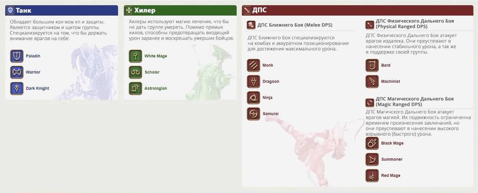 Классы в игре делятся на 3 группы: Танки, Хилеры, ДПС. ДПС в свою очередь делятся на Ближний бой, Физический дальний бой, Магический дальний бой.