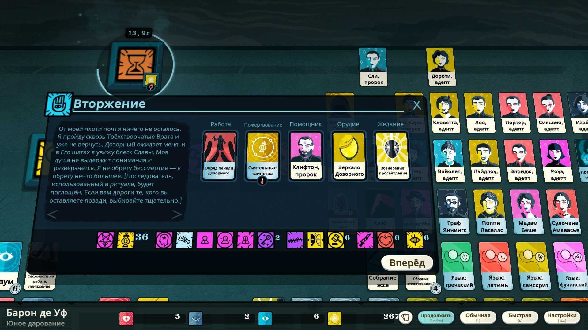 Cultist Simulator поначалу выглядит как унылый пасьянс, но не разочаровывайтесь: авторы создали ужасно проработанную оккультную мифологию. Вселенной здесь правят абстрактные божественные сущности, так называемые «Часы». Они — отражение архетипов нашего сознания, вроде «Полковника» (фигура отца из фрейдизма), «Кровавого Грааля» (все наши самые порочные желания), «Кузницы» (просветление через боль, дисциплину и перерождение) и так далее. Ритуальный каннибализм, оргии и чтение мозговыносящих древних манускриптов прилагается.