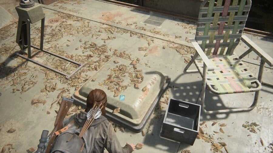 Вы сможете найти этот сейф вскоре после того, как достигнете большей области, показанной на картинке ниже. Элли заметит лестницу вдалеке, ведущую к следующему месту. Найти и открыть хранилище необходимо до использования этой лесенки.