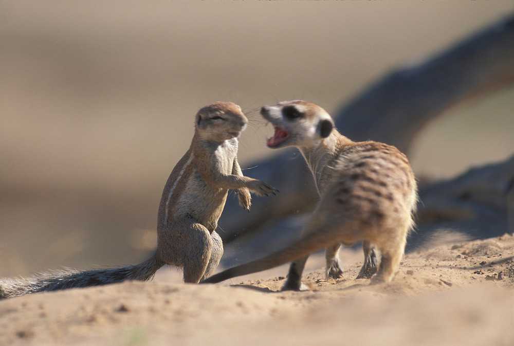 Несмотря на свои небольшие размеры, сурикаты имеют достаточно агрессивный характер. Особенно это проявляется во время стычек за территории, когда зверьки яростно атакуют представителей соседних кланов. Нередко такие поединки заканчиваются смертью одного или нескольких хищников.