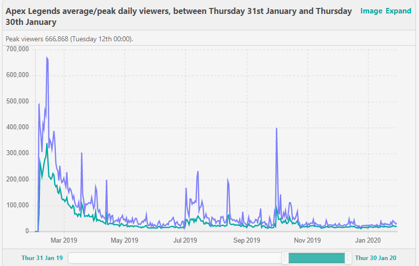 Посмотрим статистику: после выхода второго обновления в июле 2019 года в течение двух недель среднее количество зрителей на Twitch не падало ниже отметки в 30 тысяч человек. Обновление получилось удачным, и в среднем игру смотрели около 25 тысяч человек в течение всего сезона. Третий сезон, вышедший 1 октября, побил рекорды просмотров в пост-релизовое время: на пике игру смотрели более 250 тысяч человек. Однако, в отличие от второго сезона, интерес к третьему сезону упал быстрее, поэтому в конце 2020 года среднем Apex Legends смотрели 15-20 тысяч человек.