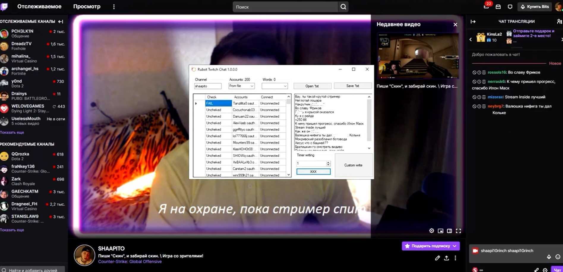 Выяснилось, что агент Некоглая Katana хорошо знаком со стримерами, которые давно накручивают зрителей с помощью программ. Такие боты могут улучшить статистику и даже общаться в чате стримера как реальные люди — с помощью заранее подготовленных фраз. Аккаунты ботов часто сидели на канале n3koglai и других трансляций сообщества стримеров ZAVOD.
