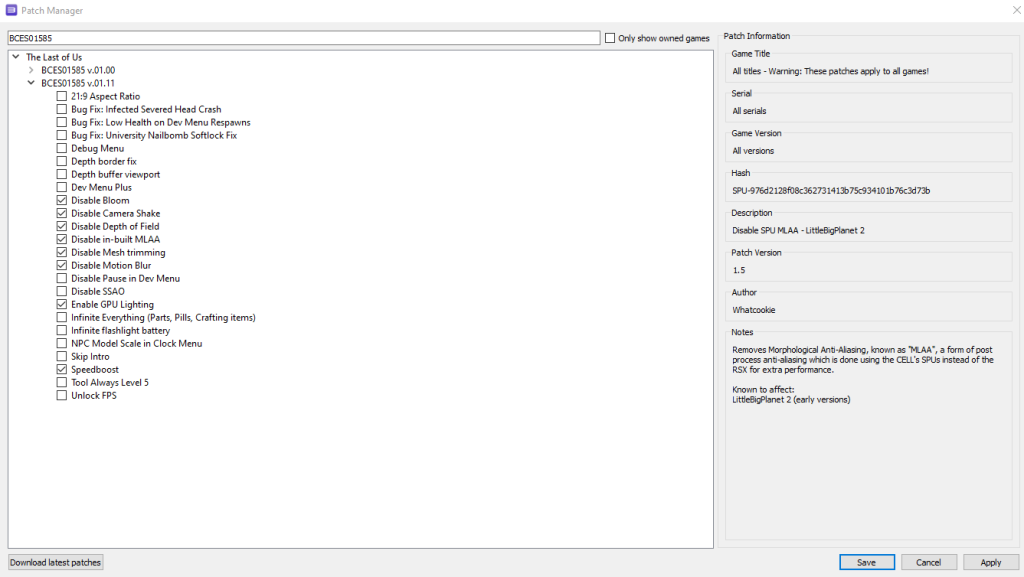 Также мы (иногда) будем ставить патчи. Для этого ПКМ по игре и нажимаем «Manage Game Patches». Открывается такое окошко (см. рис. 6). Тут у нас показаны все патчи для нашей игры, в моем случае это The Last of Us 1.11.