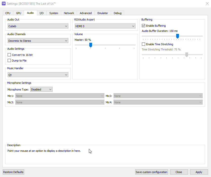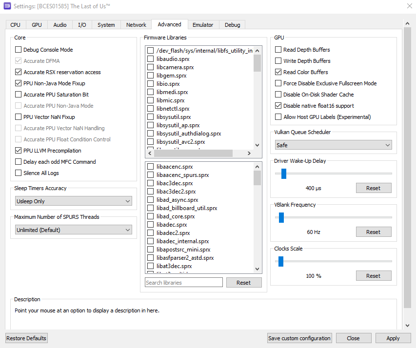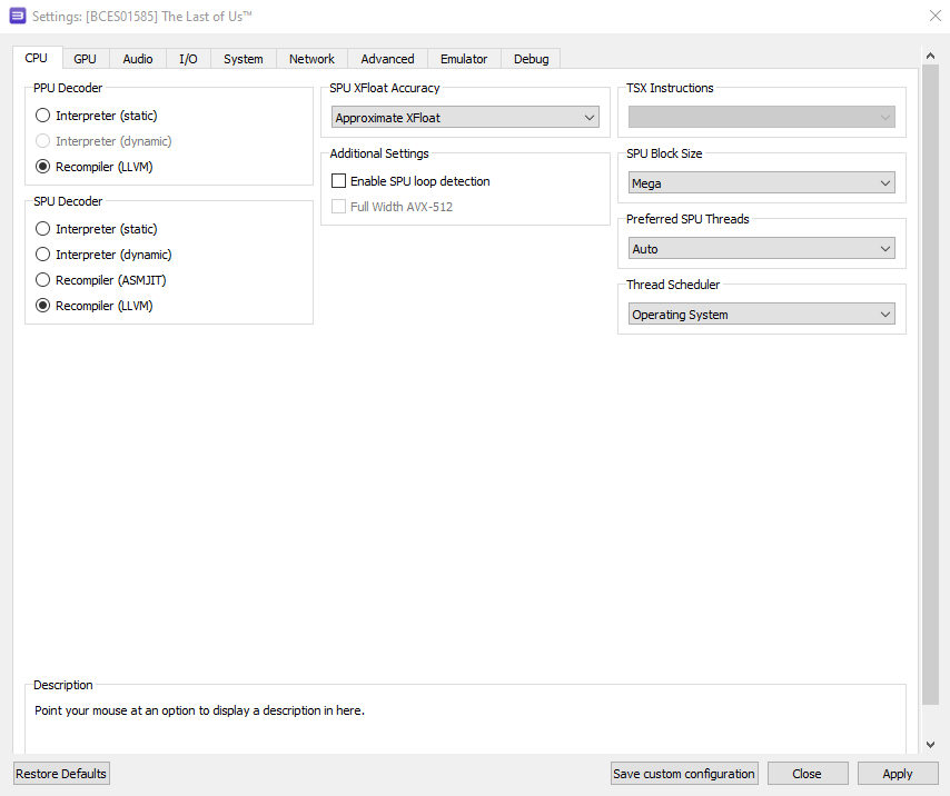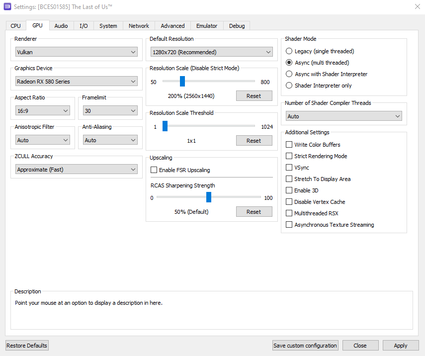 Покажу на примере The Last of Us. Сначала нажимаем ПКМ по игре и выбираем «Create Custom Configuration» (Далее эта кнопка будет называться «Change Custom Configuration»). Здесь у нас те же самые настройки, что и у самого эмулятора. Тут мы будем выставлять настройки под конкретно нашу игру. Выставляем необходимые настройки (об этом ниже) и нажимаем «Save Custom Configuration».