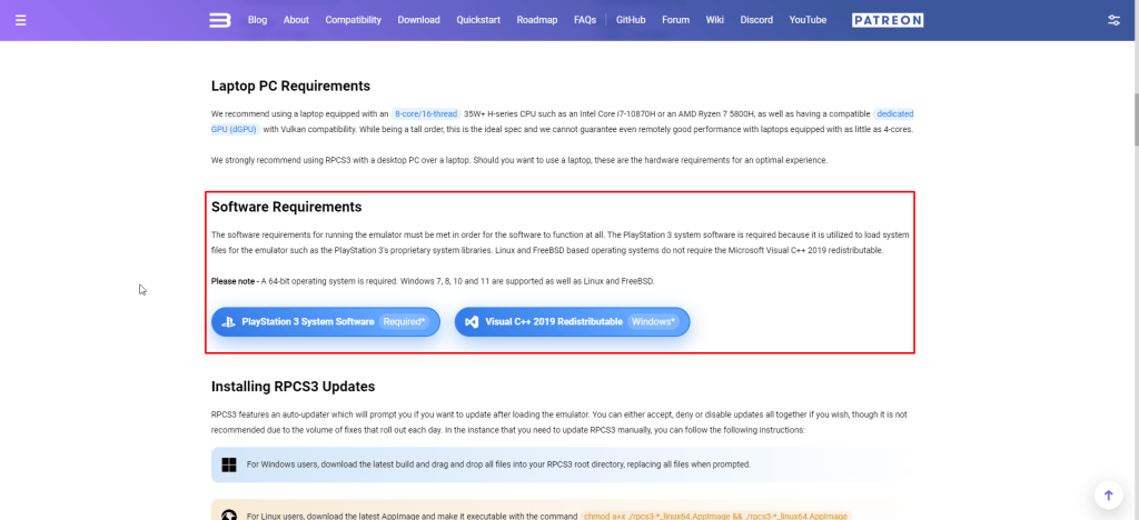 Скачать в официального сайта Microsoft или на сайте RPCS3 в разделе «Quickstart». Пролистываем чуть ниже до пункта «Software Requirements» и нажимаем на «Visual C++ 2019 Redistributable Windows*».